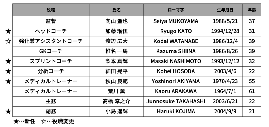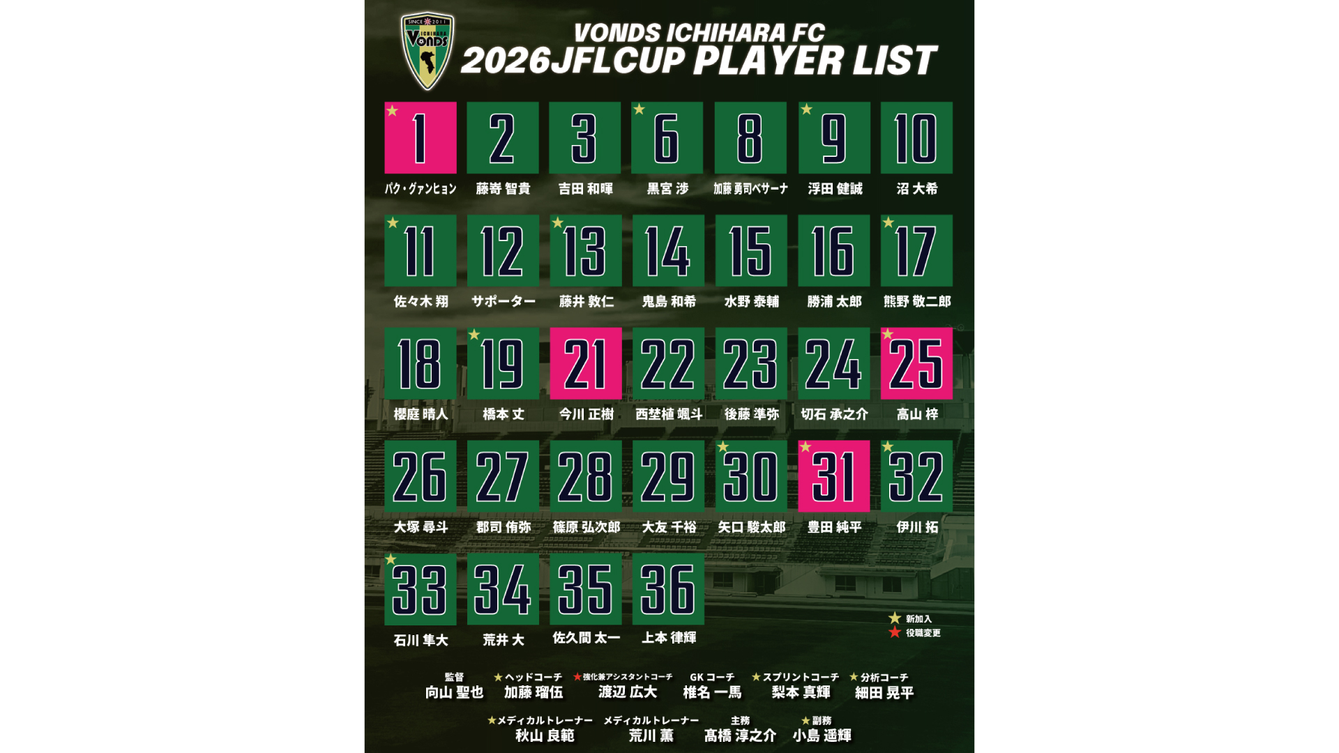 【TOP】2026シーズン(JFL CUP)体制について 投稿日 2026.01.23 著者 清野智世 カテゴリー トップ 日頃よりVONDS市原への温かいご声援、誠にありがとうございます。 この度、VONDS市原FCの2026シーズン(JFL CUP)体制についてお知らせいたします。※今回発表した背番号は『2026年度JFL CUP(仮称)』限定着用となります。2026-2027シーズンの背番号とは異なりますので、あらかじめご了承ください。 ■チームスタッフ ■VONDS市原FC トップチーム選手一覧 ※2026/01/23現在