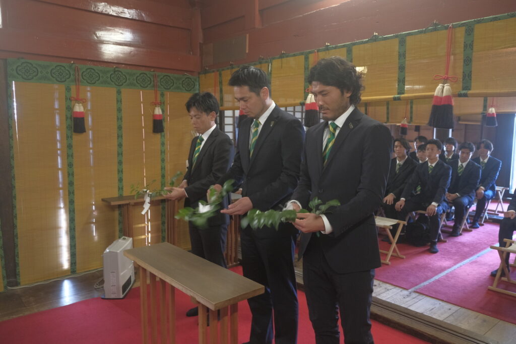 快晴に恵まれた必勝祈願当日は、トップチームの監督・選手・スタッフが参列し、今シーズンの飛躍と無事を祈願いたしました。1300年以上の歴史を誇り、源氏や徳川氏などからの崇敬も厚い市原市の古社「飯香岡八幡宮」の厳かな雰囲気の中、チーム一丸となって戦う決意を新たにする機会となりました。