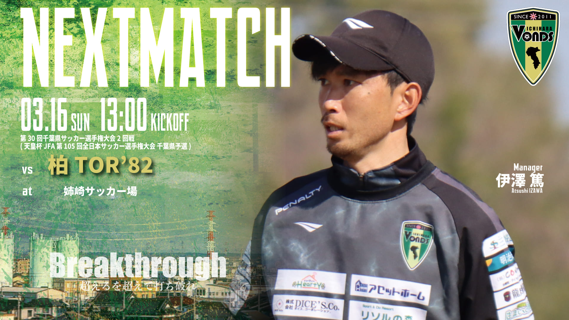 3/16(日)に開催予定の【第30回千葉県サッカー選手権大会(天皇杯 JFA 第105回全日本サッカー選手権大会 千葉県予選) 2回戦 柏TOR’82】戦についてお知らせします。
