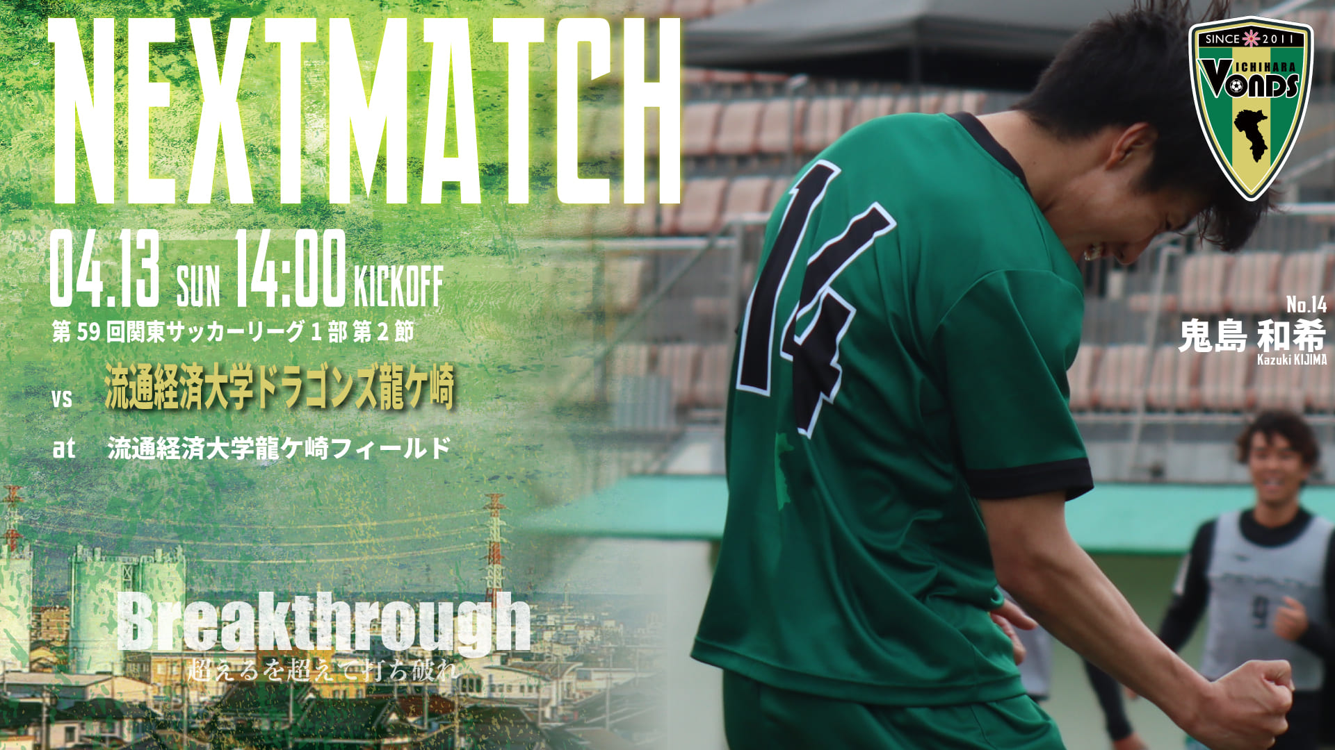 4/13(日)に開催予定の【第59回関東サッカーリーグ1部 第2節 流通経済大学ドラゴンズ龍ケ崎】戦についてお知らせします。