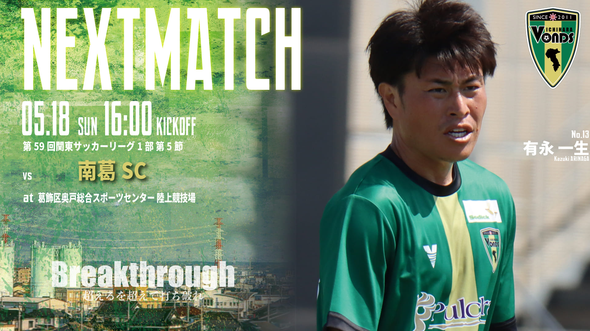 5/18(日)に開催予定の【第59回関東サッカーリーグ1部 第5節 南葛SC】戦についてお知らせします。