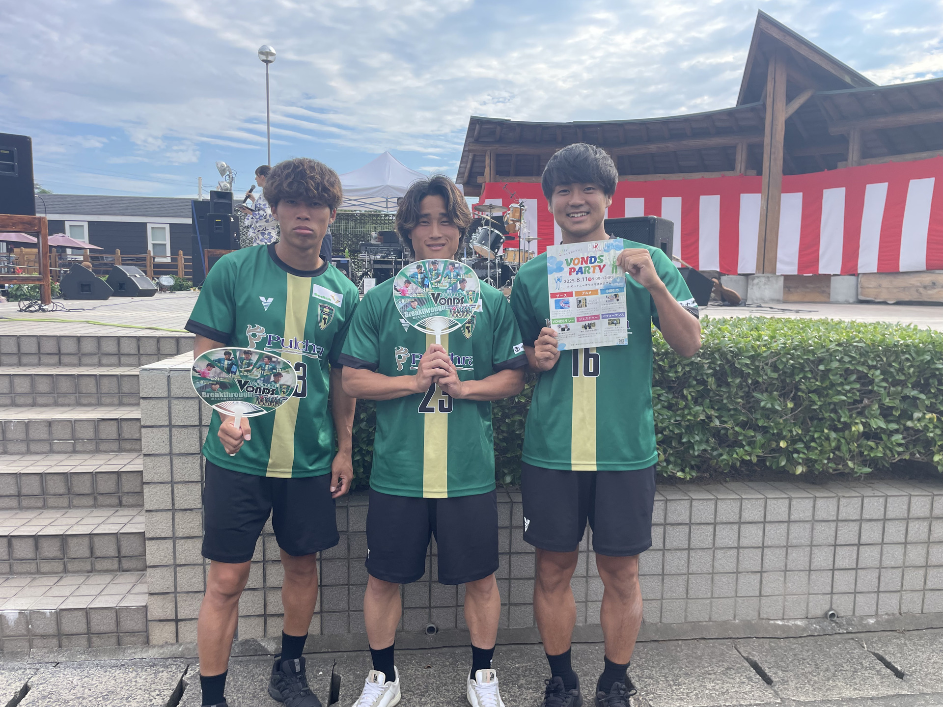 当日は、ふる里学舎 納涼祭のオープニングセレモニーから参加し、VONDS市原FC No.16勝浦太郎選手、No.23 後藤準弥選手、No.33 須藤栄二選手の3名がステージに登壇し、クラブ及びファン感謝祭(雨天のため開催中止)の紹介をさせていただきました。