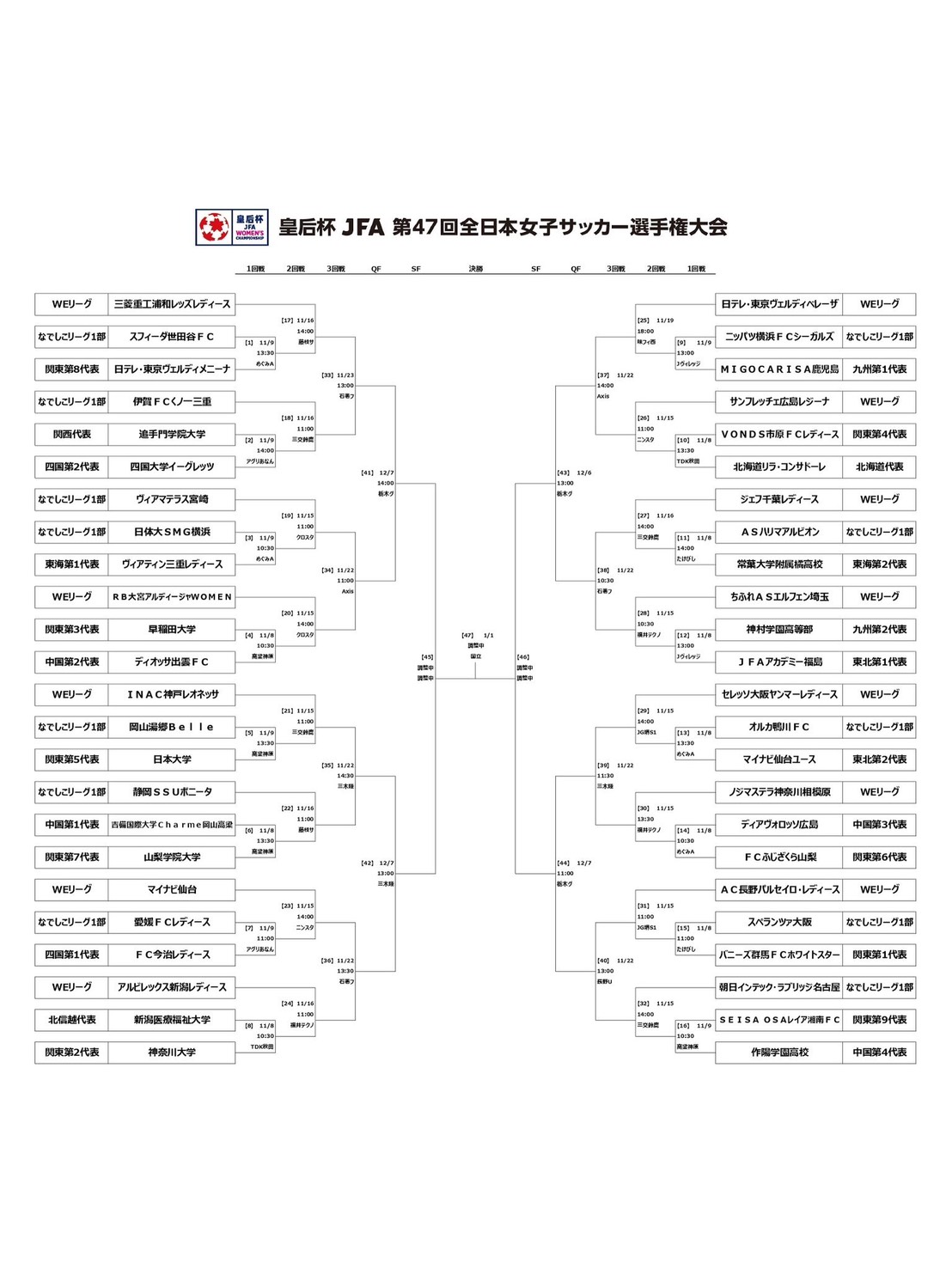 11月8日(土)から行われる【皇后杯 JFA 第47回全日本女子サッカー選手権大会】の組み合わせ・日程が決定しましたので、お知らせします。