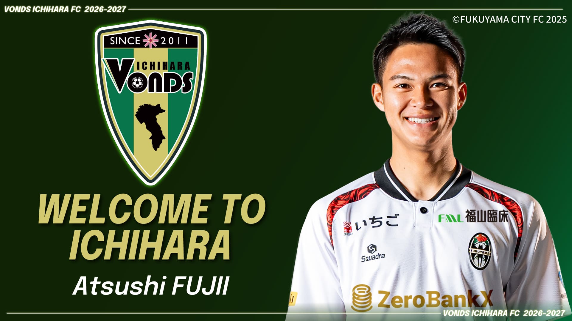 この度、藤井敦仁選手が福山シティFC(中国サッカーリーグ)より完全移籍で加入することとなりましたので、お知らせいたします。